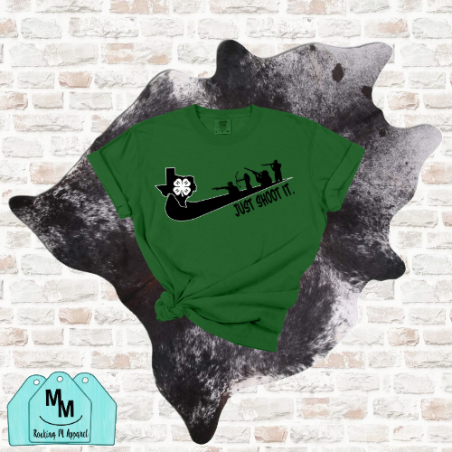 Introducing the Just Shoot It Shirt—the perfect tee for youth and parents who are passionate about 4-H shooting sports! Crafted from soft, high-quality Comfort Colors fabric, this shirt comes in a vibrant Clover color that’s both fresh and bold. True to size for a relaxed, comfortable fit, it's ideal for long days of practice or casual outings. Featuring a fun and motivating "Just Shoot It" design, this shirt is perfect for those who take pride in their shooting skills and love the competitive spirit of 4-H. Whether you’re a young competitor or a proud parent cheering them on, the Just Shoot It Shirt is the perfect way to show your passion for the sport!