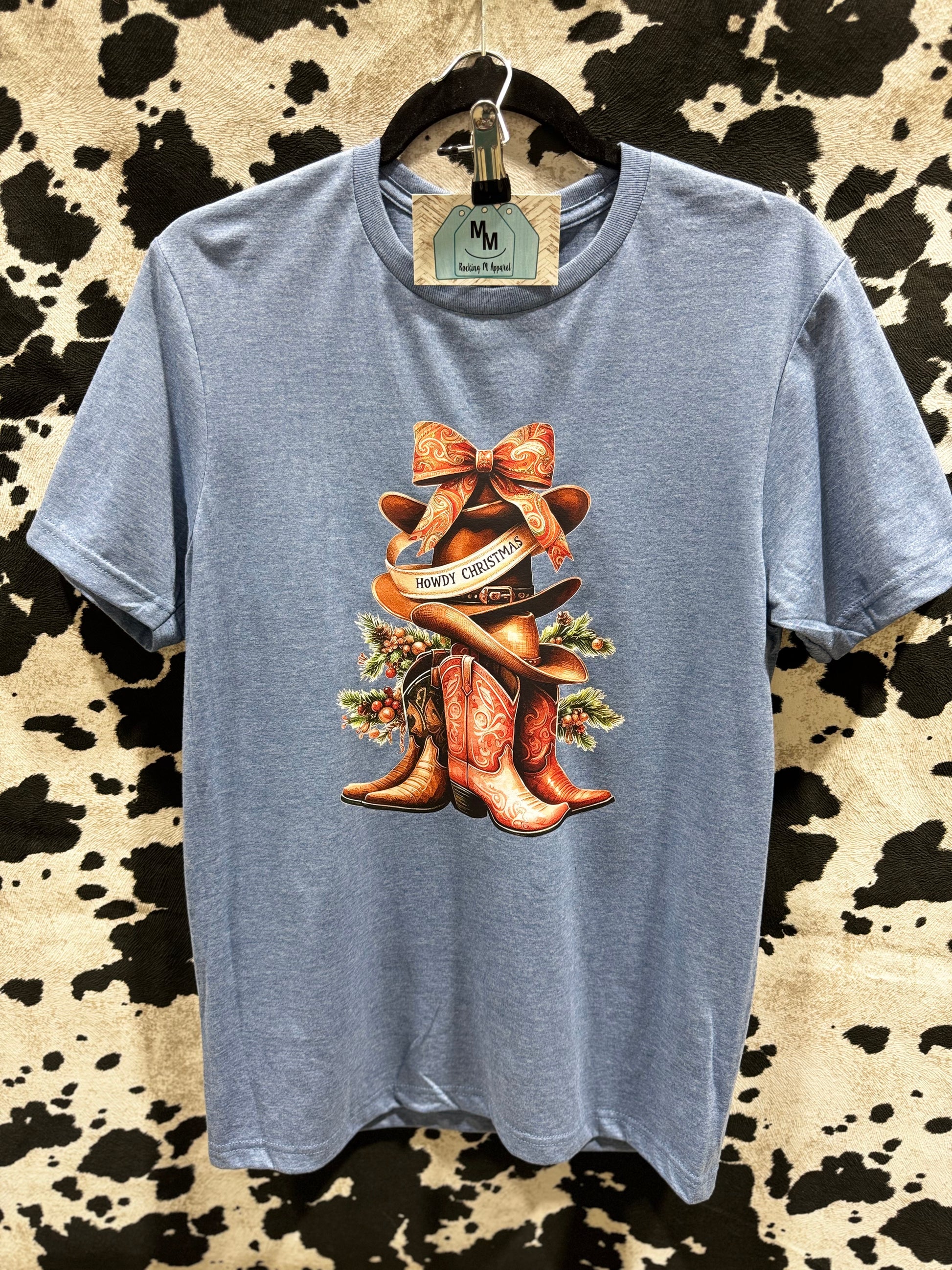 Get ready to wrangle up some holiday cheer with the Howdy Christmas Tree! This festive tree features a cowboy boot stand, a Christmas bow and hat topper, and holiday green floral accents, on a Heather Indigo soft style shirt. Giddy up and add a touch of western charm to your holiday decor!